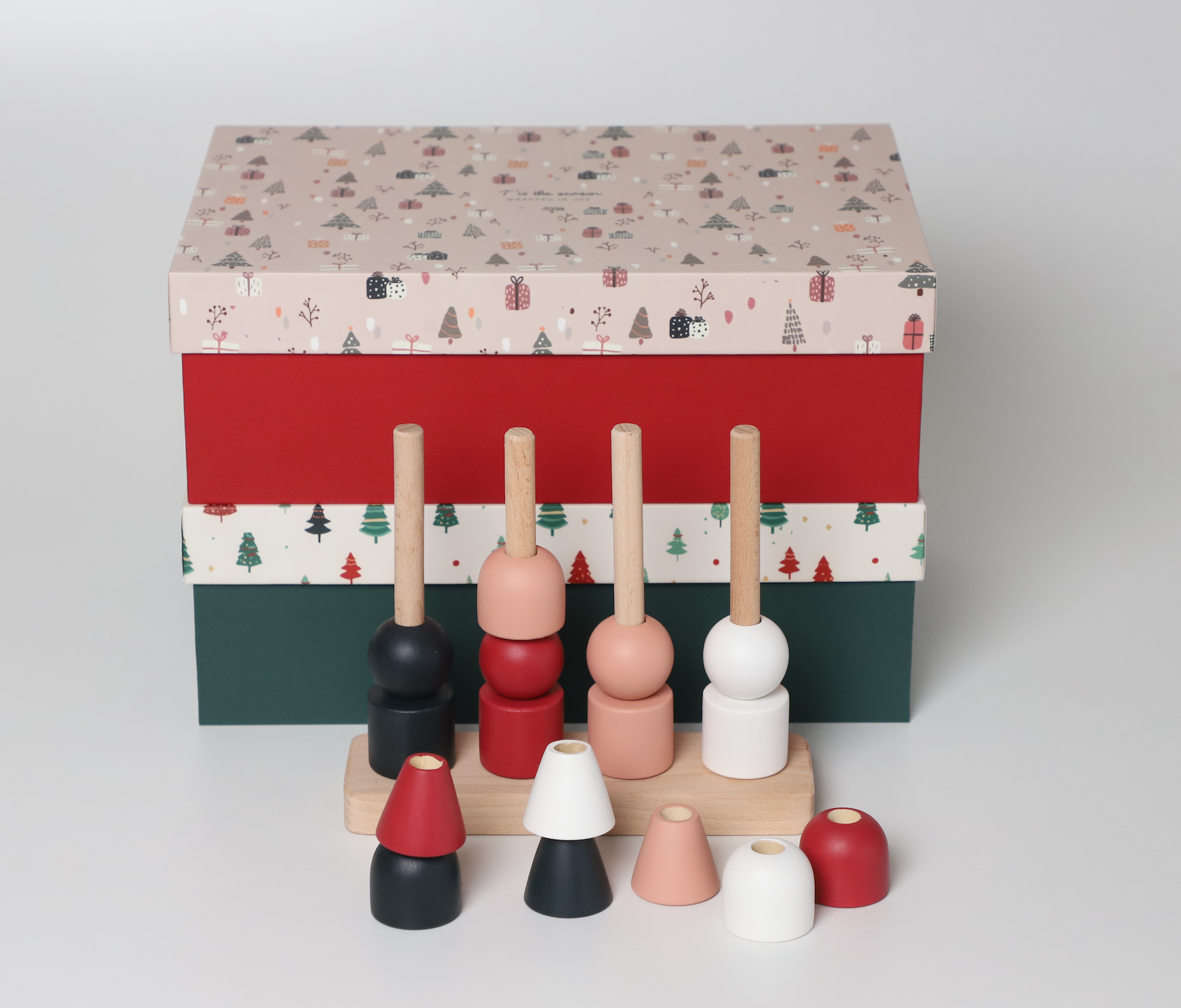 Handcrafted in smooth, natural wood and painted in warm, Christmassy hues, this special edition stacker invites little ones to build, sort, balance, and imagine endless holiday stories. From snowy peaks to candy-cane towers, each piece inspires open-ended play that grows with your child.