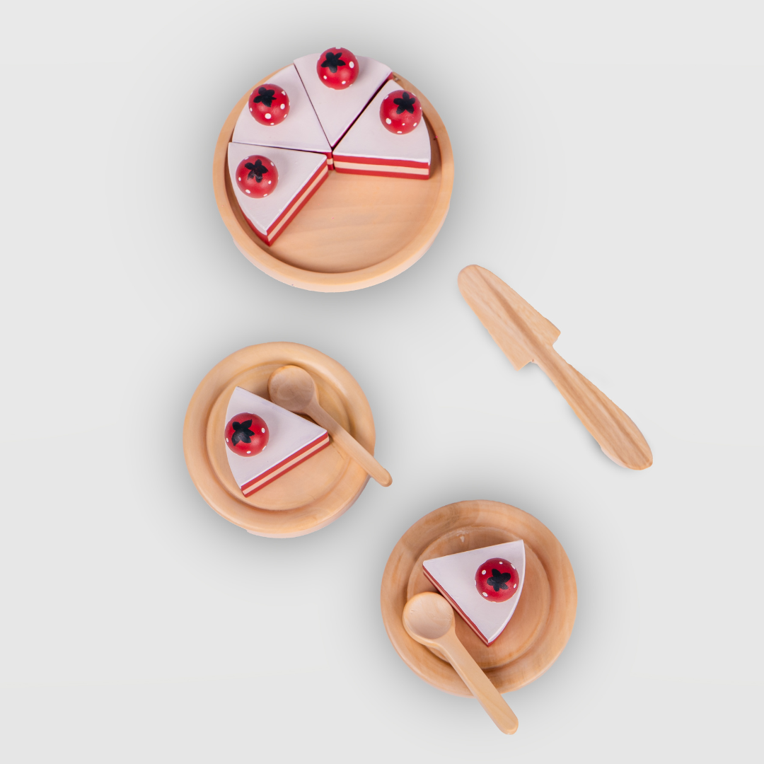 Painted in cheerful red and white tones and topped with tiny wooden strawberries, this delightful cake can be “cut” and served on matching wooden plates, making it perfect for sharing and storytelling. Each slice encourages pretend play, turn-taking, and social interaction, while the tactile experience strengthens fine motor skills and imagination.