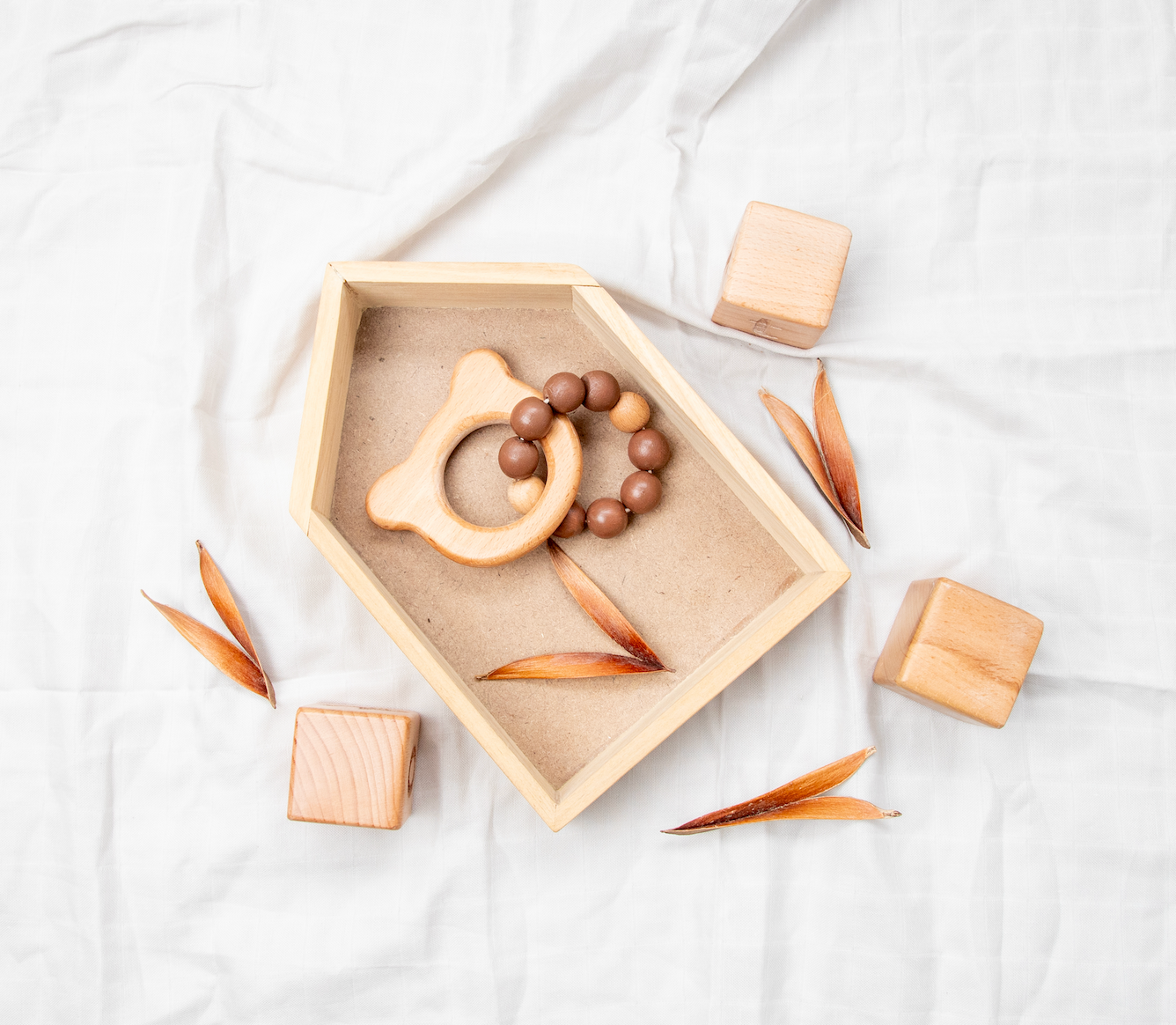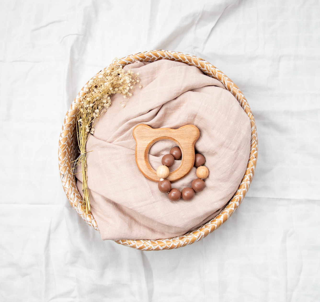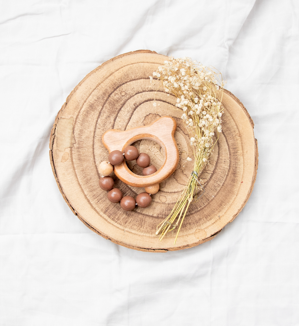 Thoughtfully crafted for tiny hands and tender gums, our Bear Teether is made from solid beechwood and features a ring of smooth beechwood beads, hand-painted in non-toxic, baby-safe colours.